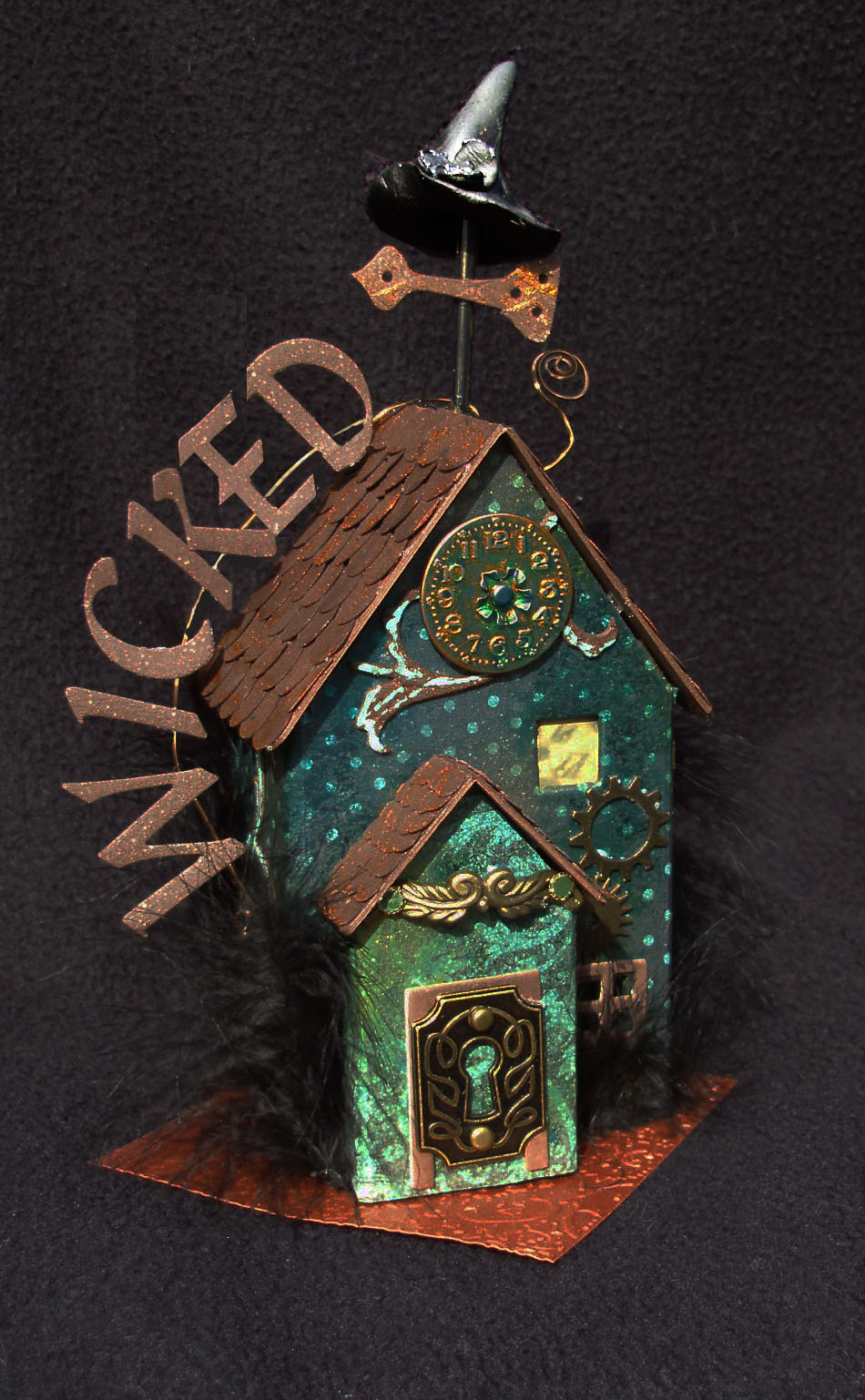 It's time for another round of the Sizzix Blog Hop with a little twist. There will be a different die each Thursday for several weeks, each by one of three different designers, and there will be more than 60 designs each week using the same die, so you'll get a huge variety of possibilities. Just click on the Sizzix button on my blog and you'll be on your way!Since I went to see Wicked Halloween night, you know what mode I have been in all week. I had actually started my design, which would have been just a simple little house using patterned papers and some lace to create a charming cottage. Well, THAT didn't happen.