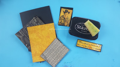 2. Sponge the edges of all pieces with black ink and apply adhesive to all pieces of paper and cardstock except the folded black card base.